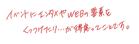 クリエはイベントのプロ、WEBのプロ、エンターテインメントのプロが1つのフロアで仕事をしている会社です。単なるイベント会社にはない複合的な組み方のご提案で、イベントのお手伝いからWEBプロモーションまでワンストップでさまざまなご要望にお応えします。