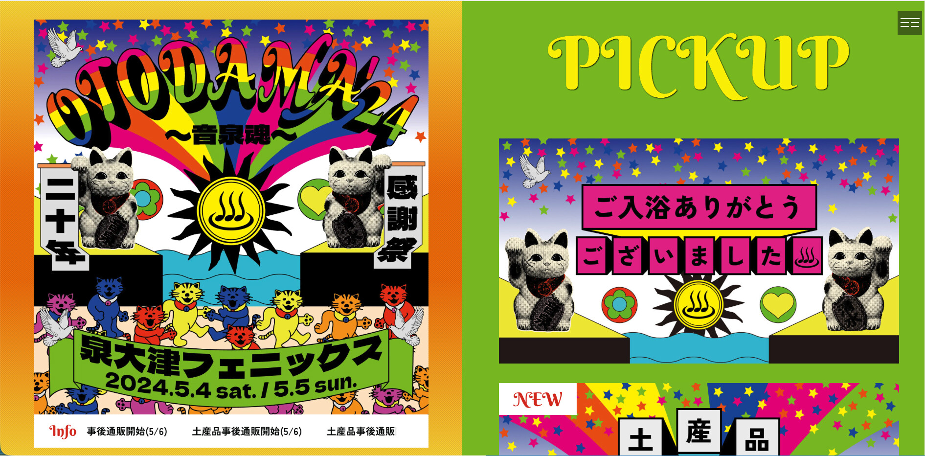 WEBサイト開発 OTODAMA'24~音泉魂~オフィシャルサイト クライアント 清水音泉 URL https://shimizuonsen.com/otodama/24/ 業務範囲 企画/運営/デザイン/コーディング/システム開発 関西のプロモーター清水音泉が主催する夏フェスのサイトをお手伝いしました。